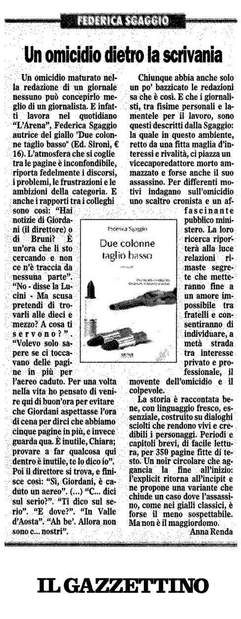 Il servizio del «Gazzettino» mette insieme un pezzo principale in cui – sotto il titolo «Redazione, labirinto di intrighi» – si inquadra l’argomento citando alcuni dei più illustri esempi di macedonia giornalistico-letteraria, dall’eccelso «Tutti gli uomini del presidente» a Stieg Larsson; un pezzo in cui Giuseppe Pietrobelli scrive del mobbing giornalistico (ma non solo) raccontato da Luigi Furini nel suo «Volevo solo lavorare»; e la recensione a «Due colonne taglio basso». Nella quale («Un omicidio dietro la scrivania») Anna Renda, tra l’altro, scrive anche questo: «Chiunque abbia anche solo un po’ bazzicato nelle redazioni sa che è così. E che i giornalisti, tra fisime personali e lamentele per il lavoro, sono questi descritti dalla Sgaggio».