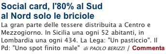 Qualcuno prova a ragionare un po’: «Prima veniamo tempestati di dati in cui si dice che il sud è sempre più provero e il nord è sempre più ricco, per poi sorprendersi se le social card sono in quantità maggiore al sud. Wirtak si chiede dov’è la notizia? La risposta è semplice: quando un fatto conferma un pregiudizio, per i media è notizia. Propongo al giornalista un’altra inchiesta: quanto si spenderà in Italia nel 2009 di ammortizzatori sociali? Ed in particolare quanto si spenderà al nord e quanto al sud. Mi racomando ci metta la stessa enfasi nel raccontarlo».