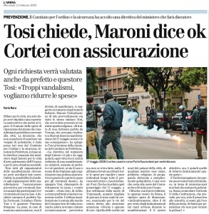 In più, «da oggi, quindi, ogni volta che ci sarà la richiesta di una manifestazione valuterò insieme al prefetto e al questore, se sia il caso o meno di far stipulare agli organizzatori una polizza assicurativa in grado di coprire le spese per gli eventuali danni», ha spiegato Tosi, chiamando direttamente in causa i «centri sociali». «Sono loro, di solito, a creare problemi e lasciare numerose scritte».