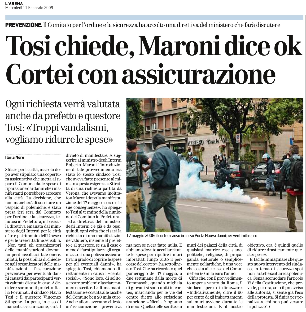Prego notare – basta cliccare sull’immagine, e lo si leggerà benissimo – che «non tutti gli organizzatori delle manifestazioni dovranno però accollarsi tale onere» (cioè, l’assicurazione). «Infatti, la possibilità di chiedere agli organizzatori delle manifestazioni l’assicurazione preventiva per eventuali danni causati dai partecipanti verrà valutata di caso in caso. A decidere saranno il prefetto Italia Fortunati, il sindaco Flavio Tosi e il questore Vincenzo Stingone. La pena, in caso di mancata assicurazione, sarà il divieto di manifestare».