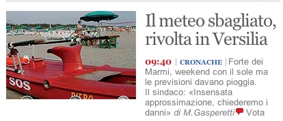 Mi piacerebbe capire se gli albergatori versiliani sarebbero disposti a restituire i soldi che i turisti hanno versato prenotando – ipotesi – quindici giorni di vacanze sotto il sole (perché così dicevano le previsioni), se poi in quelle due settimane è piovuto a dirotto.