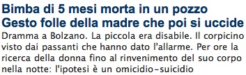 La donna – maestra d’asilo, amante dei bambini, madre anche di un bambino di 5 anni – non era riuscita a superare il trauma della nascita di una bimba disabile e ieri sembra aver ceduto alla propria disperazione. (… ed) è nel dolore di questa donna che non riusciva ad accettare la nascita della figlia che bisogna indagare.