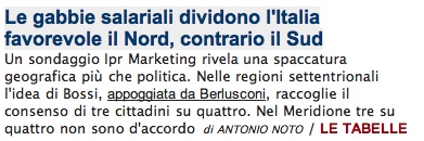 Soltanto un tipo veramente bizzarro poteva pensar che la questione delle gabbie salariali, anche per il modo e per il momento (soprattutto) in cui è proposta, abbia qualcosa a che vedere con la politica e non, invece, con il puro e semplice antimeridionalismo che è diventato ideologia imperante al nord (tre su quattro favorevoli).