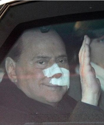 Uscendo dall’ospedale con quella sghemba maschera bianca che sfigura lineamenti già di per sé alterati e disordinatamente estroflessi da decenni di rimodellamento artificiale, e salutando da quella macchina con una mano ieratica e benedicente secondo l’iconografia bizantina, il «dolore» al quale Berlusconi fa riferimento non si limita a riferirsi al puro senso di afflizione fisica o al versamento e all’ostensione del suo sangue.