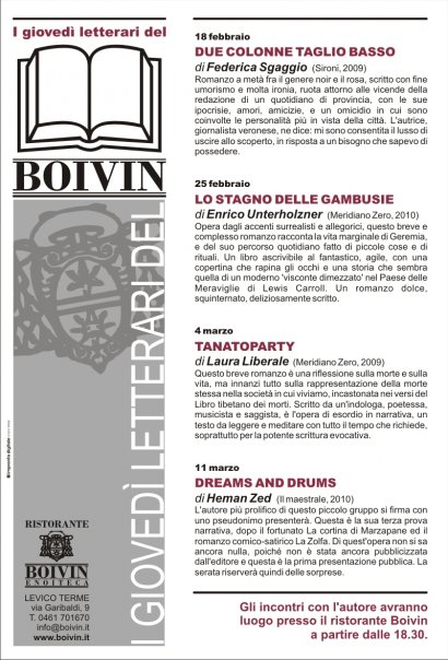 Oggi alle 18.30 Claudia Boscolo, co-fondatrice del progetto PrecarieMenti (lo spazio virtuale dei lavoratori intellettuali sottosalariati e senza tutele), parlerà con me di «Due colonne taglio basso» al ristorante Boivin, in via Garibaldi 9 a Levico Terme (Trento), dove comincia giusto oggi una rassegna – «I giovedì letterari del Boivin», appunto – che Claudia ha organizzato insieme a Luca Giudici.
