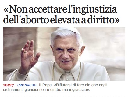 – in conclusione. io credo che papa benedetto XVI non stia facendo davvero nulla di illecito, non da una prospettiva religiosa ma nemmeno laica, nell’esprimersi in modo recisamente contrario all’aborto. illecito, da un punto di vista logico e quindi politico e quindi giuridico, sarebbe però che la sua opinione (la sua “interpretazione”) venisse assunta, per la semplice autorevolezza della sua figura, quale principio d’ordine giuridico di una comunità estesa: non più religiosa ma politica. con ciò confondendo, truccando, la misura dell’intepretazione con quella del diritto.