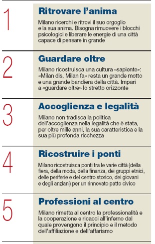 «Milano ricostruisca ponti tra le varie città (della fiera, della moda, della finanza, dei gruppi etnici, delle periferie e del centro storico, dei giovani e degli anziani) per un rinnovato patto civico.