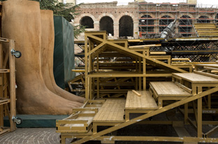 Siccome ogni sera c’è un’opera diversa, ogni notte le scenografie vengono portate via dall’anfiteatro e sistemate in questi recinti che riempiono la piazza.