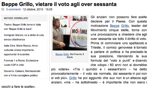 Trippi, scusami: la storia è così intricata che non sono riuscita a farmene un’idea solida. Quindi ho tolto il link perché non ho avuto il tempo di approfondire. D’altra parte, alla mia perplessità su Grillo basta e avanza, per ora, la sua uscita sull’opportunità di vietare agli ultrasessantenni l’accesso all’elettorato attivo.