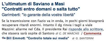 Saviano ormai ci crede a metà. E lancia un ultimatum al direttore generale. “Se tutti i contratti non vengono firmati entro venerdì, io lascio e salta tutto”.In 48 ore bisogna recuperare il pasticcio fatto negli ultimi giorni. Dimostrare che era solo “un problema di gestione aziendale e non di contenuti perché io non faccio censure preventive”, come ha scolpito nella pietra Masi l’altra sera.