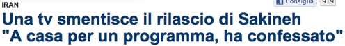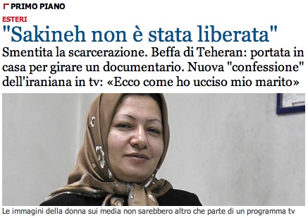 e Stampa quasi sbracano (vedi foto che illustra il post): Sakineh è stata condannata per omicidio (e non solo per adulterio), e comunque la liberazione non c’è stata, ce ne scusiamo con gli interessati e con i lettori, tipo.