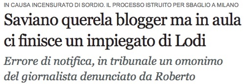 Leggo qui che Saviano ha querelato un blogger casertano settantenne che – sostiene Giornalettismo emettendo già la sentenza che Saviano chiede al giudice di emettere – «perde molto del suo tempo a diffamarlo via web», ma per sbaglio la notifica è stata trasmessa a un omonimo lombardo che fa l’impiegato.