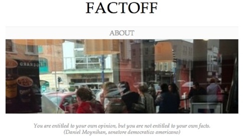Si chiama Factoff: il nome si richiama ai «fatti» e alla parola «off», avverbio-preposizione-aggettivo-nome-verbo con un’enormità di significati: «via», «finito», «esaurito», «lontano», «in errore», «completamente», «del tutto», «fino in fondo», e perfino «uccidere».