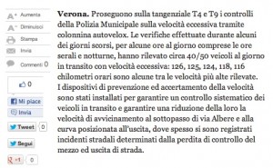 Proseguono sulla tangenziale T4 e T9 i controlli della Polizia Municipale sulla velocità eccessiva tramite colonnina autovelox. Le verifiche effettuate durante alcuni dei giorni scorsi, per alcune ore al giorno comprese le ore serali e notturne, hanno rilevato circa 40/50 veicoli al giorno in transito con velocità eccessiva: 126, 125, 124, 118, 116 chilometri orari sono alcune tra le velocità più alte rilevate.