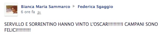 Mia zia, poi, mi piazza un post in bacheca per dire, in lettere maiuscole, che «I CAMPANI SONO CONTENTI». Credo ci siano dei punti esclamativi.