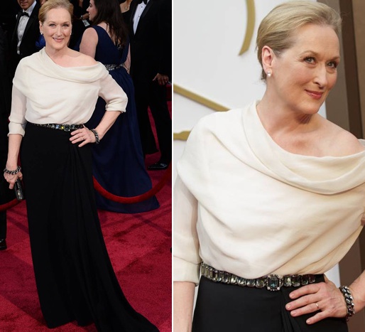 Quanto alla Streep, io capisco che lei ha un’età. Ma il suo bianco e nero ha forse un taglio troppo deciso in vita. Non so: è come un accoppiamento dell’ultimo minuto che non tiene conto dell’effetto generale. Il sopra è molto bello, dà luce al viso. Il sotto è molto bello, scivola meravigliosamente. Insieme non stanno bene, però, anche se la pesantezza dei tessuti è perfettamente compatibile.