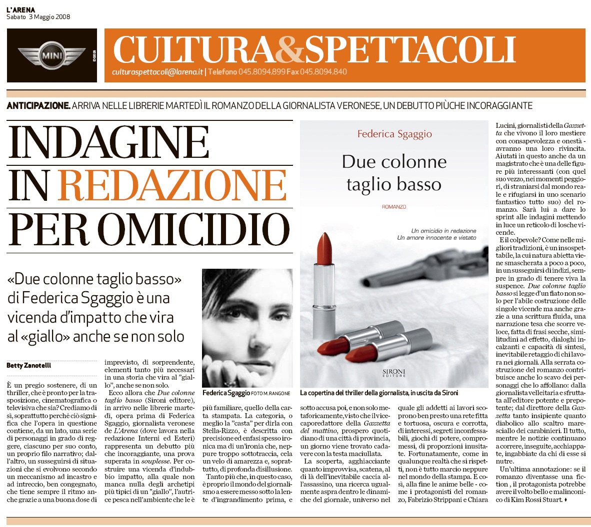 Ecco allora che Due colonne taglio basso (Sironi editore), in arrivo nelle librerie martedì, opera prima di Federica Sgaggio, giornalista veronese de L’Arena (dove lavora nella redazione Interni ed Esteri) rappresenta un debutto più che incoraggiante, una prova superata in souplesse.